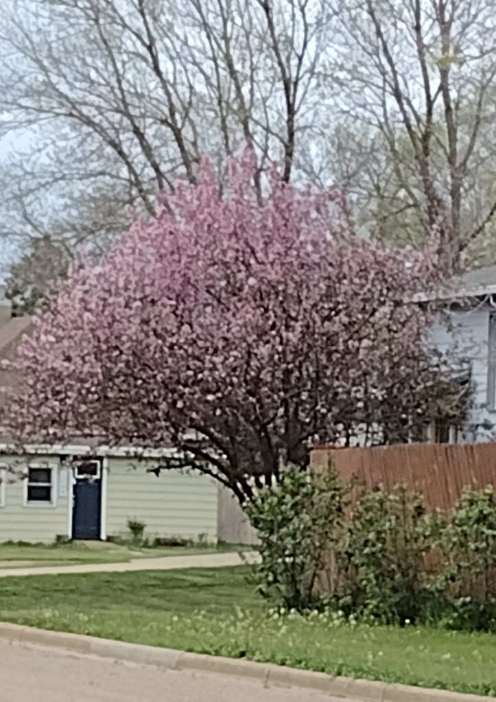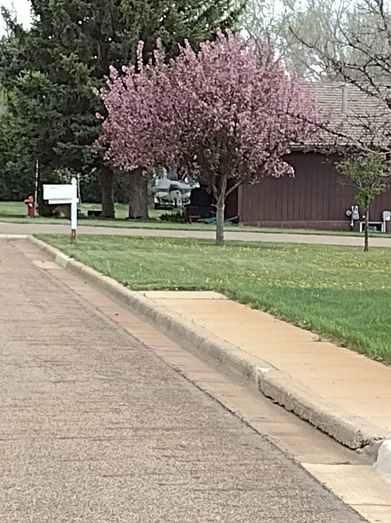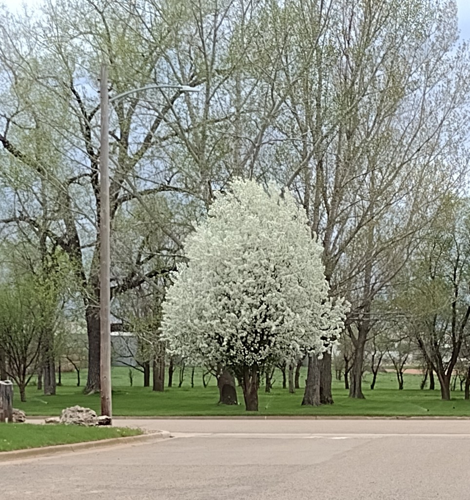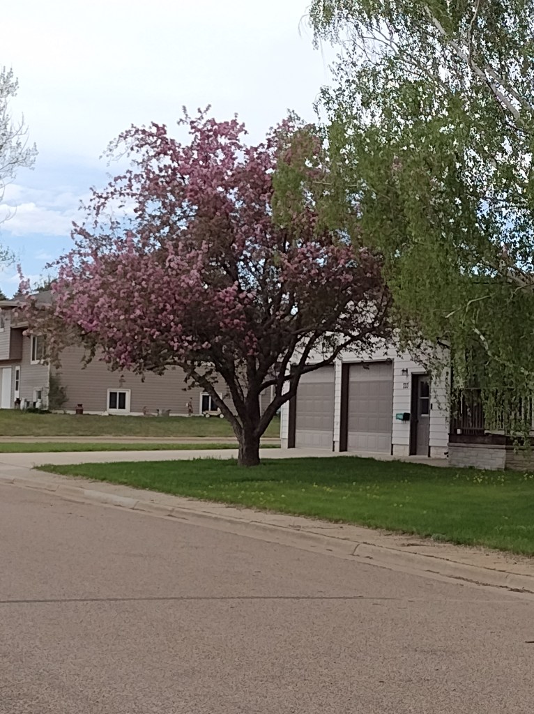 After the snow melts away in the Spring in New England, North Dakota, by May the grass becomes very green, apple trees blossom in white, cherry trees blossom in purple-red, and lilac trees blossom in lavender.